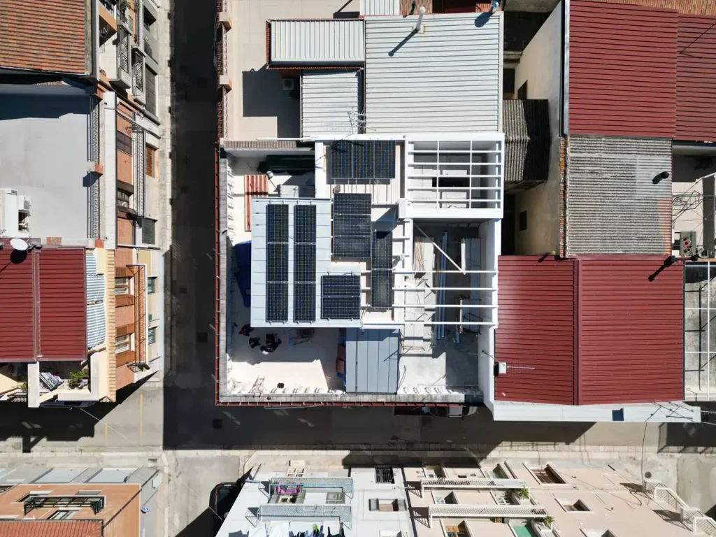 Edificio con sistema costruttivo di alto valore architettonico: facciata ventilata realizzata con pannelli in cemento a massa colorata EQUITONE Natura. Infissi a mono-anta con vetri riscaldati, sistema VMC integrato e climatizzazione caldo/freddo a soffitto. Tettoia in aggetto di 5 metri completamente priva di pilastri.